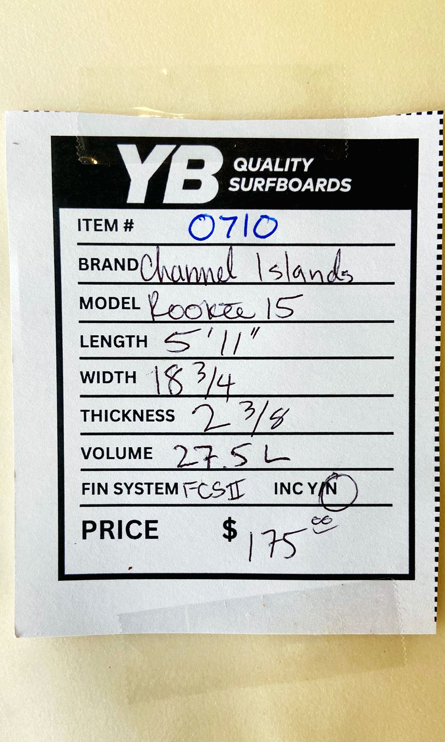 This is a Channel Islands 5'11" Rookie 15 Surfboard. Board is in decent condition with major deck dents.