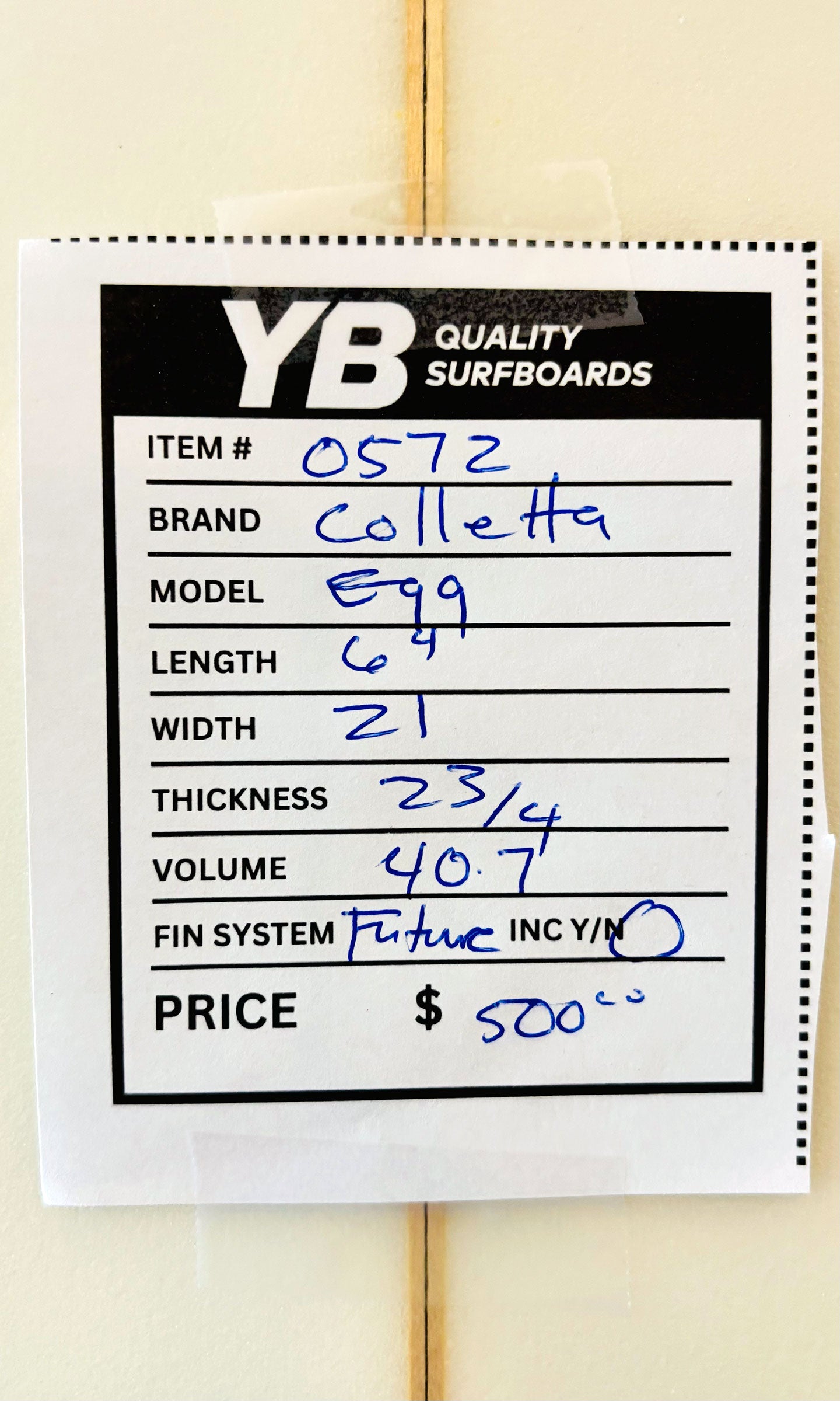 This is a Coletta 6'4" 40.7L Quad Egg Surfboard. Board is in excellent condition with minor deck dents.