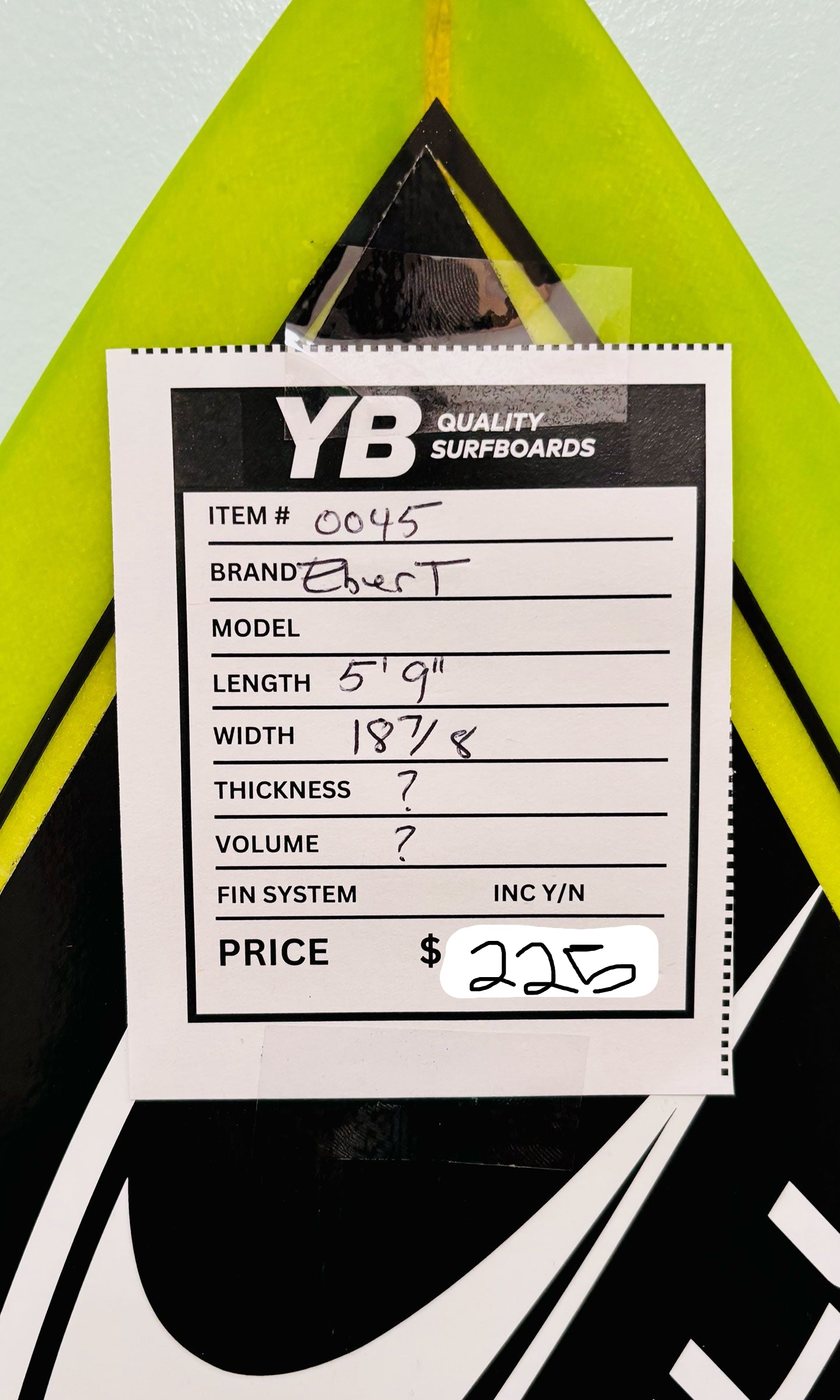 This is a Ebert 5'9" x 18 3/4" single fin surfboard. Surfboard has some pressure dents.