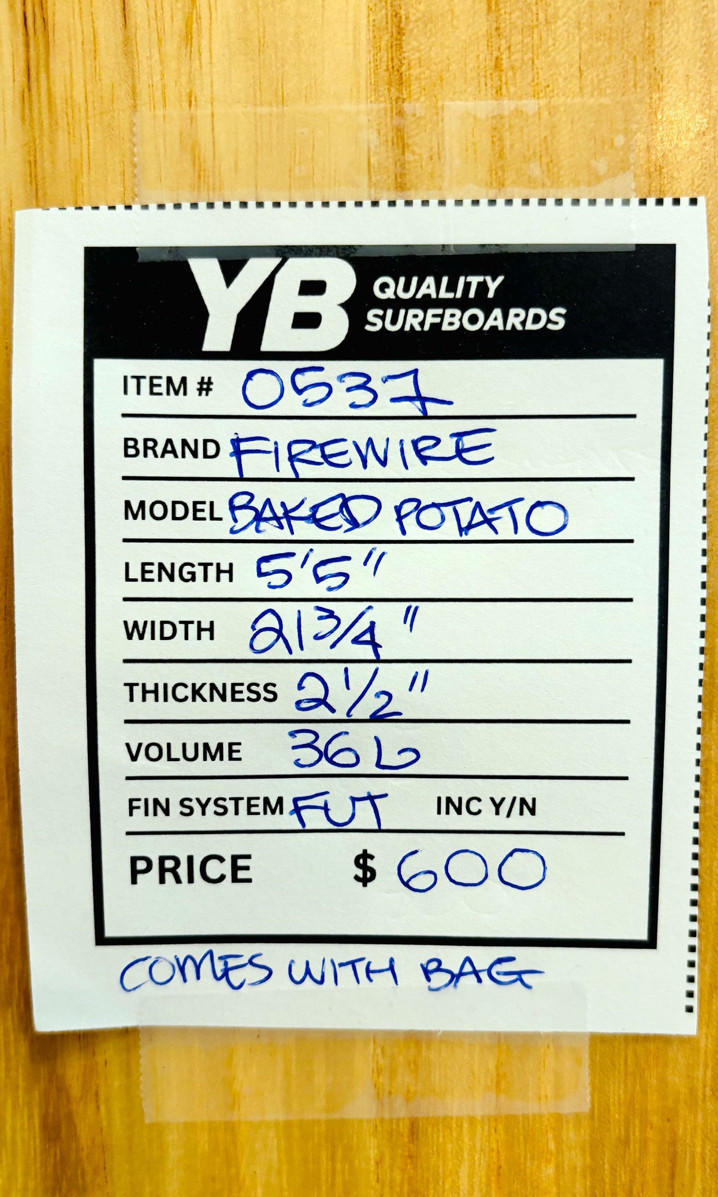 This is a Firewire 5'5" 36L Baked Potato Surfboard. Board is in excellent condition with one small fixed ding. Board comes with a bag.