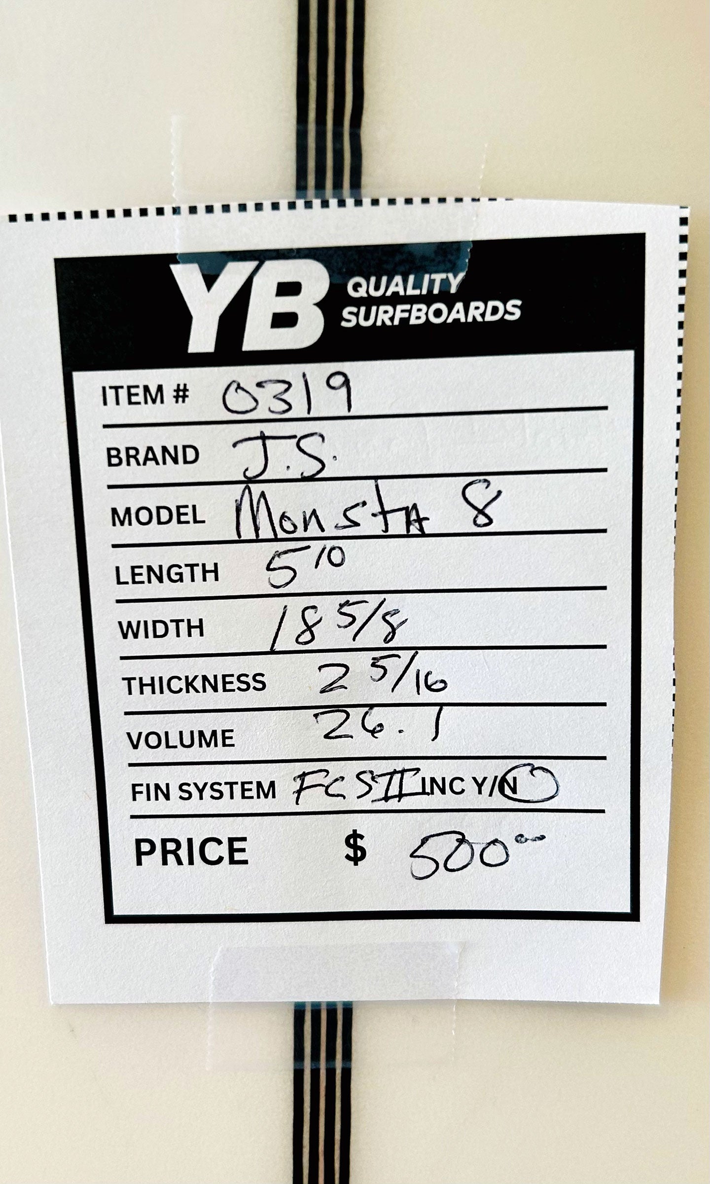 This is a JS 5'10" 26.1L Monsta 8 Surfboard. Board is in excellent condition.