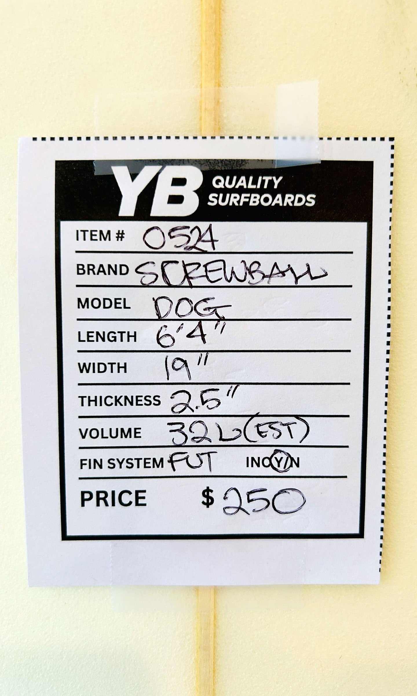This is a Screwball 6'4" 32L Dog Model Surfboard. Board is in good condition with deck dents. Solid but dented. Comes with fins.